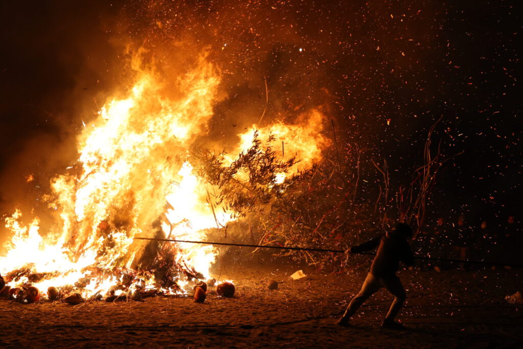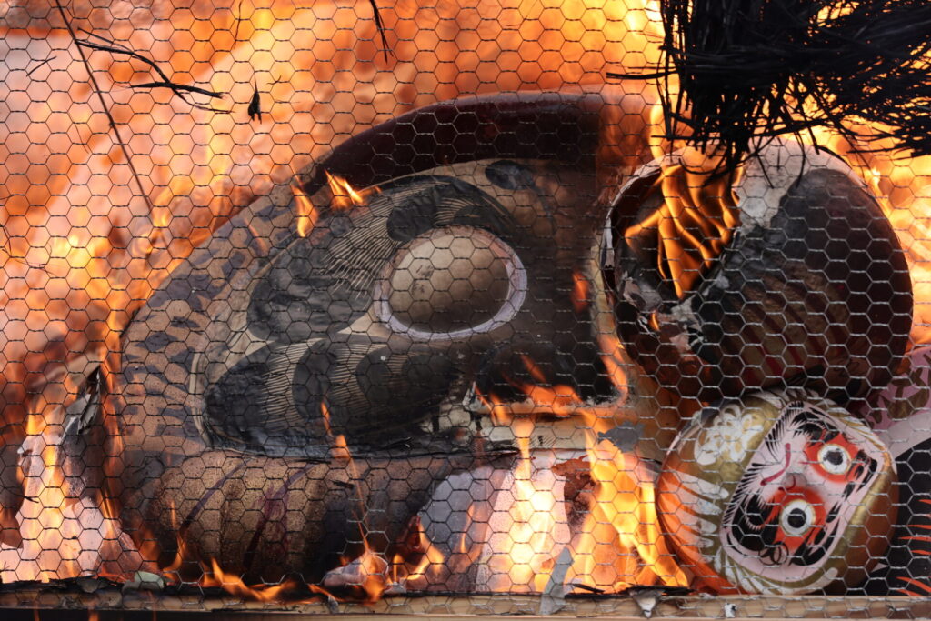 今年最初の撮影は大磯から。全国でとんど焼き、どんど焼き、さいと焼きなど色々呼び方がされる行事ですね。大磯のものは国の重要無形文化財に指定されており、9基のサイトが立てられる大規模な祭りとなっています。自分の地域ではやっていませんでしたが、ある程度燃えてきたら引き倒すので中々迫力があります。