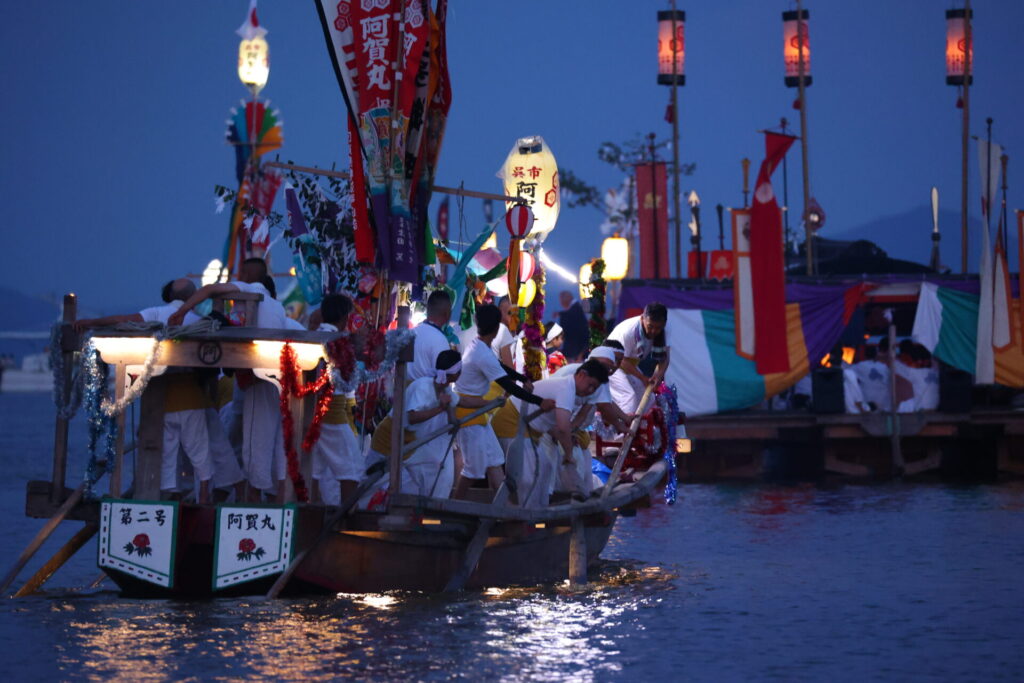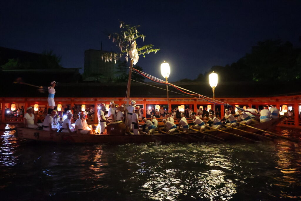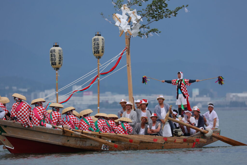 みこしを載せた管弦船を3隻の船が引いて対岸の神社を周って戻ってくるという神事です。