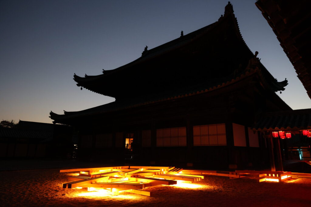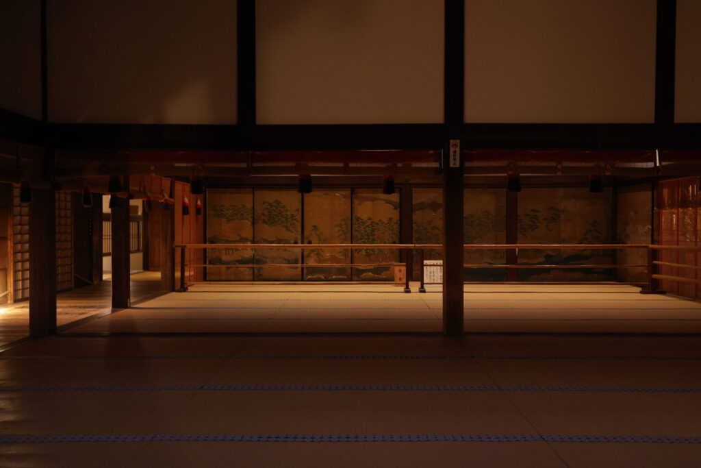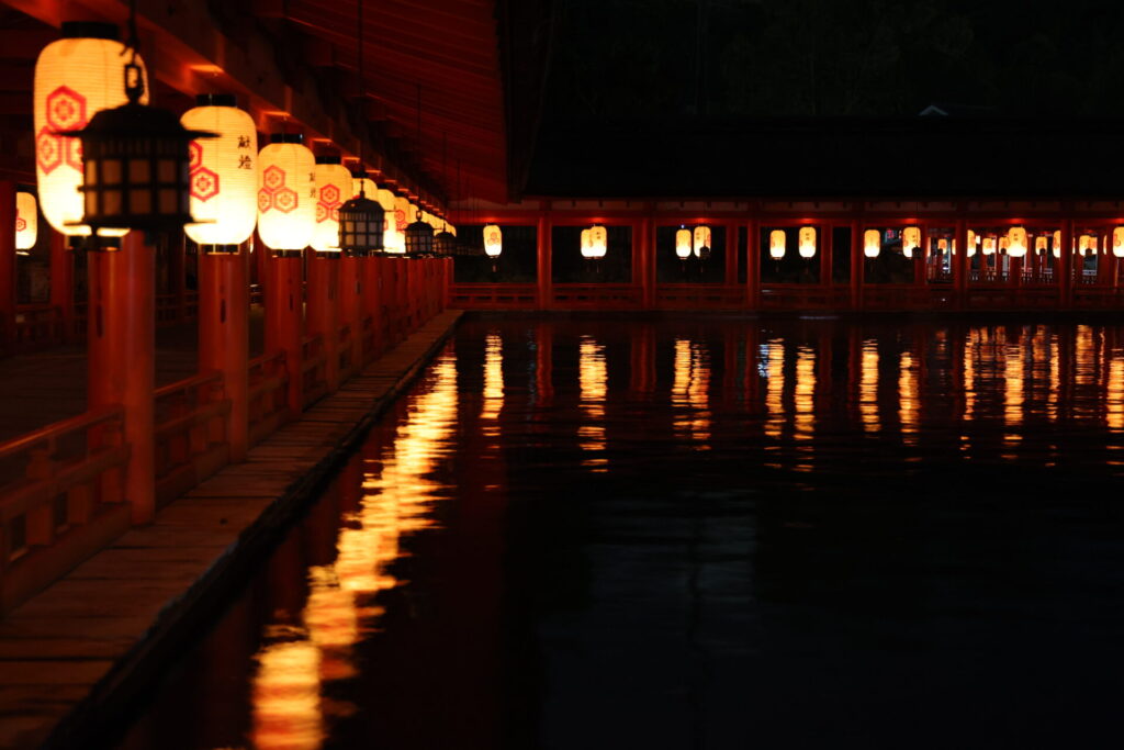 意外と良かったのが夜の厳島神社に入れたことです。普段は入れないのと大潮の日なので提灯が水面に反射するいい画が撮れます。